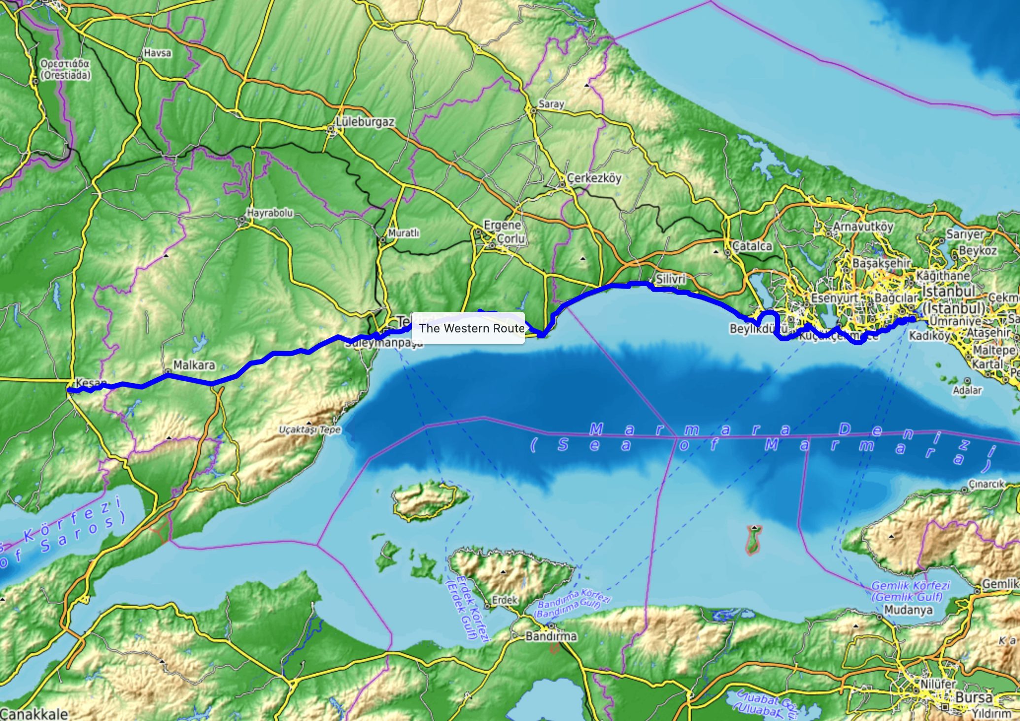 The Western Route follows the E84 / D110, but avoids it whenever possible. We leave the E84 in Silivri and continue on the D100 towards our destination.