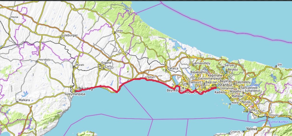 The route is busy but easy to manage. In many places, it is possible to avoid the main road. There are plenty of nice and quiet alternatives, especially between Tekirdağ and Silivri.